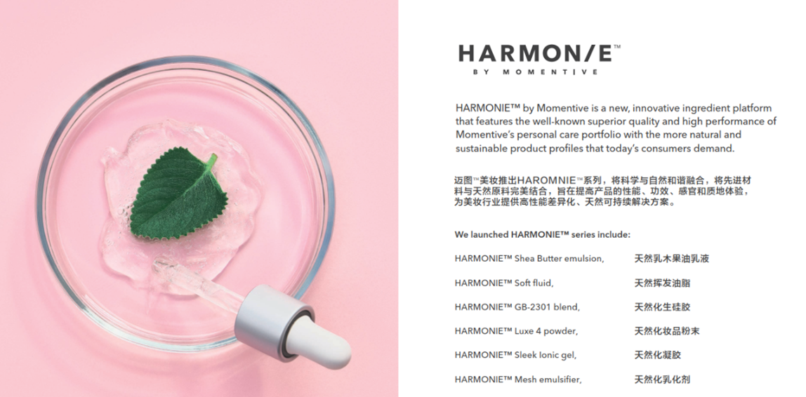 私たちのコアコンピテンシーは、化粧持続効果、肌感触の最適化、光学的な美しさ、表面改質、ソフトコンディショニングなどがあります。 クリーンな美しさを求めるトレンドに応えるため、科学と自然を調和させ、高性能で差別化された、自然で持続可能なソリューションを化粧品業界に提供するHARMONIE 自然由来シリーズ製品を立ち上げました。 現在、HARMONIEシリーズでは、揮発性の自然由来アルカンオイルのHARMONIE Soft fluid (自然由来指数0.7, ISO16128)、HARMONIE Soft fluidと高重合度ジメチコノールのブレンド製品のHARMONIE GB-2301 blend(自然由来指数0.57, ISO16128)、自己乳化型自然由来シリコーンジェルのHARMONIE Sleek Ionic gel (自然由来指数0.63, ISO16128)、贅沢な肌触りの自然由来化粧品パウダーのHARMONIE Luxe 4 powder(自然由来指数1, ISO16128)を含む6製品で構成されています。