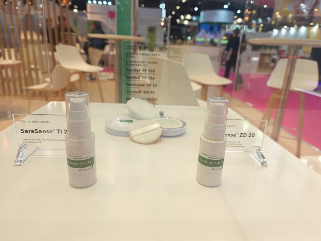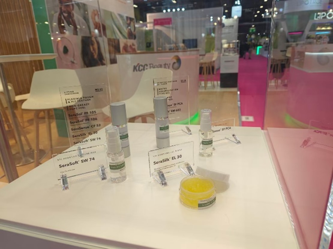 KCC Beautyは分散スラリー日焼け止めに加え、相乗効果で日焼け止め効果を高める製品、液状シリコーンワックスSeraSoft™ SW 74と差別化されたシリコーンエラストマーSeraSilk™ EL 30を展示しました。 また、感熱性樹脂皮膜剤SeraSense RBS 11、相溶性を向上させるヒドロキシシリコーンオイルSeraSense CF 52、PEGフリーのポリグリセリンシリコーン乳化剤・分散剤SeraSol PF 105、106、107も展示しました。