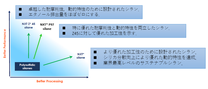 主にリビングアニオン重合の活性末端停止剤として使用されるポリマー変性用シランです。タイヤトレッドコンパウンド用の溶液重合SBRの末端変性剤として使用することで、シリカの分散向上効果が得られます。