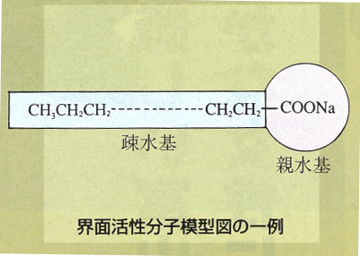 ここでいう起泡性の物質とは泡を形成する液体に均一に溶解して、液体と気体の液膜に吸着し、表面張力を低下させる働きをするものです。分子中に親水性部分と疎水性部分を持つことが構造上の特徴で、その代表的なものが石けんや中性洗剤などです。