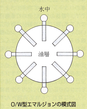 水と油の混合物を激しく撹拌すると一時的に分散できますが、すぐに再び分離します。これに、微量の乳化剤を加えることにより、安定な混合物ができます。エマルジョンには、水の中に油を分散したO/W型 油の中に水を分散したWO型があります。O/W型の例としては牛乳など、WO型としてはマーガリンなどがあります。