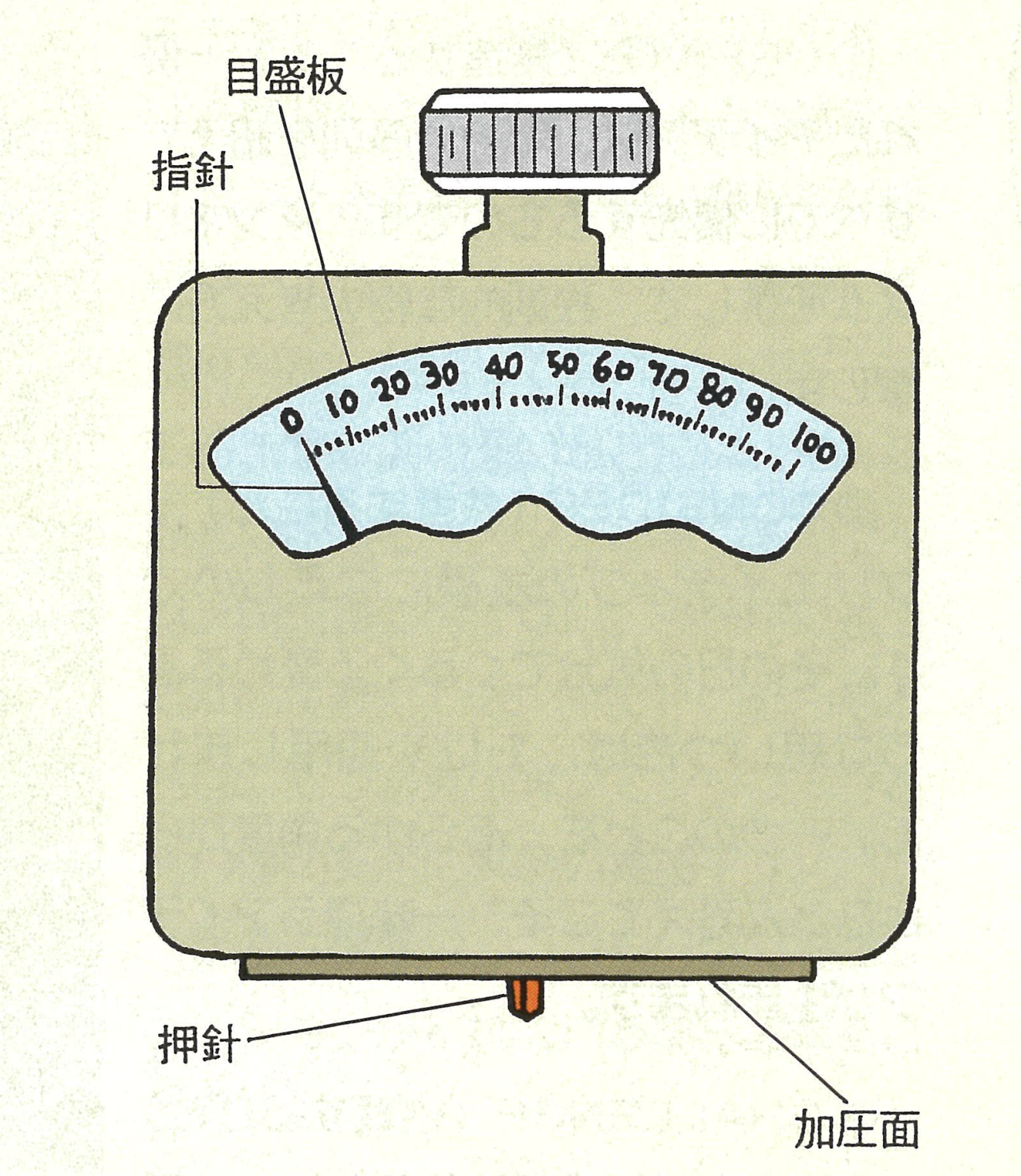 試験片表面に加圧面を接触させたとき、加圧面の中心から、ばね力により突き出している押針が、ゴム面によって押し戻される距離を硬さとして目盛りに示すような構造になっています。