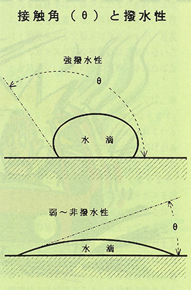 A 物体の表面は、その分子が持つ力によって、近接する水の分子を引き寄せようとします。その度合いは、その表面の物理的・化学的構造によって異なります。しかし、この力が十分に大きくて、水の凝集力に打ち勝ったとき、水は広がって表面が濡れます。逆に、物体表面の引力が弱いと、水は凝集力で丸まって水滴になり、いわば水が撥かれた状態になります。図中の接触角は濡れにくさの度合いを示すもので、90°を超えると強い撥水性があることになります。シリコーン膜は、もともと引力の小さいメチル基が表面に並んでいるので撥水性を示します。ジメチルシリコーンオイルで処理したガラス板の、水に対する接触角は約103°です。(下図参照)