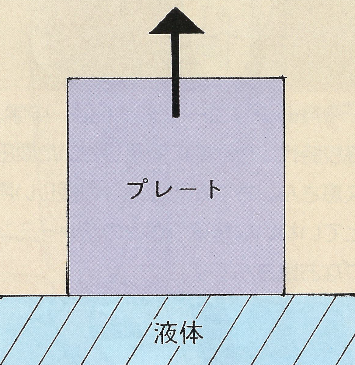 ウィルヘルミーの表面張力計は、プレートを引き上げる時に釣り合った力から求めます(下図参照)。