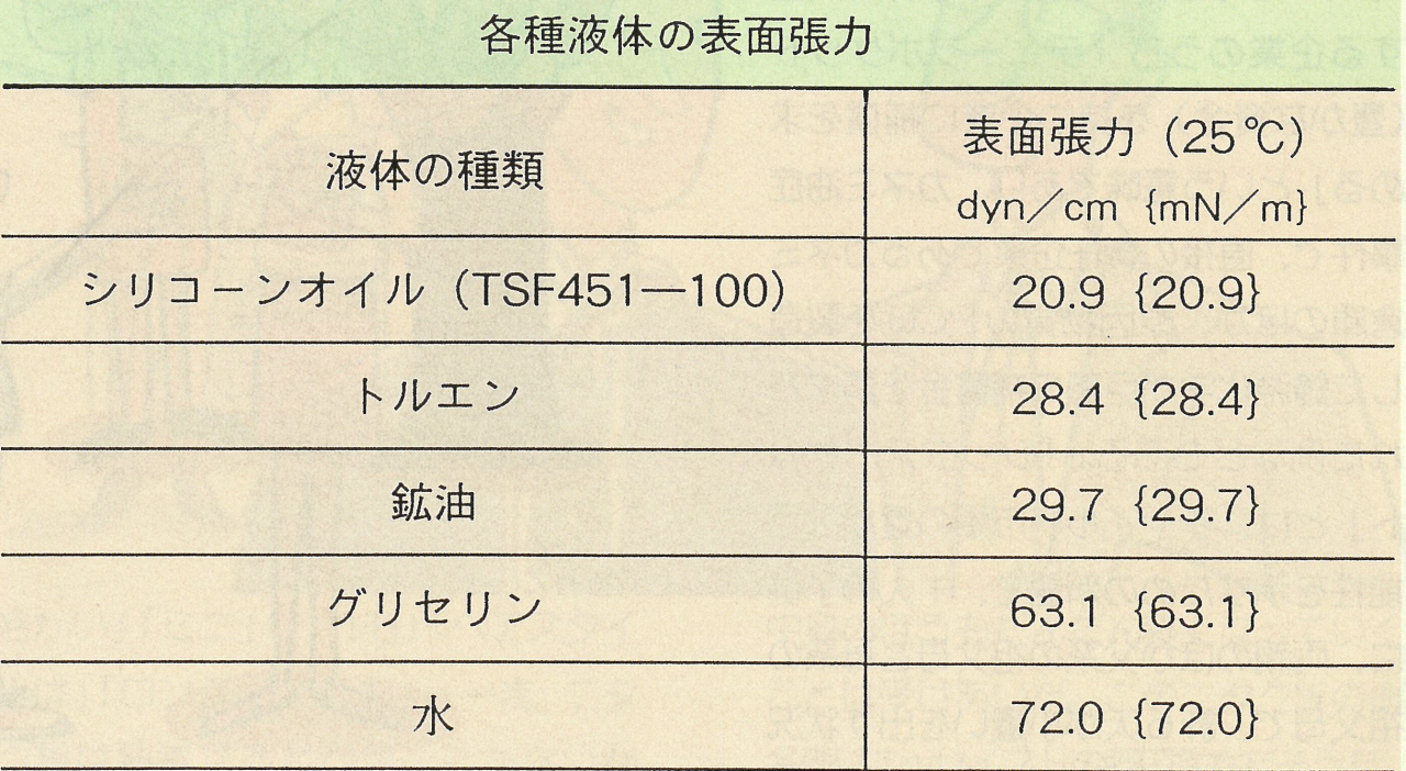シリコーンオイルの表面張力は約16~22 dyn/cmと鉱油と比べて低いことが特徴です(下表参照)。表面張力が低いと、表面への広がり性や浸透性が大きくなります。この性質を応用して、シリコーンオイルは消泡剤、つや出し剤、塗料添加剤などとして用いられています。