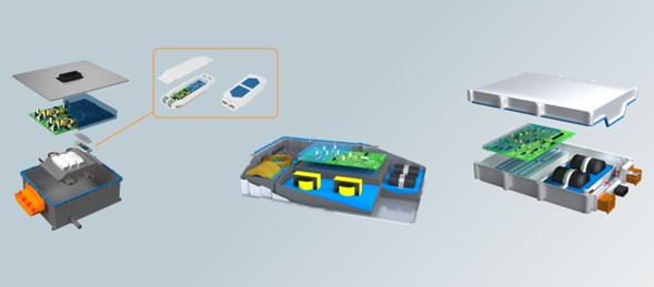 A eletrônica de potência do veículo processa, controla e distribui energia elétrica para outros sistemas, além de gerenciar a velocidade e o torque do motor. As soluções de silicone da Momentive garantem gerenciamento térmico, encapsulamento e vedação para componentes eletrônicos de potência, incluindo: sistemas de inversores e módulos IGBT, conversores CC/CC, carregadores de bordo (as áreas em azul na imagem indicam as aplicações dos materiais).